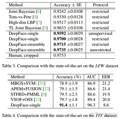 LFW上测试,无监督不如有监督性能好,集成学习性能更好,在LFW数据集达到了97.35%的准确度,将当时技术水平的误差减少了27%以上,接近人类水平的表现。