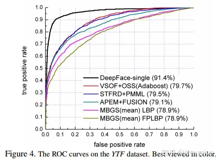 TYF视频级人脸验证数据集上性能也好很多,ROC曲线上DeepFace在左上角,性能最好。我们通过为每对训练视频创建50对帧(每个视频一个帧)来直接使用DeepFace-Single表示,并根据视频训练对将这些帧标记为相同或不相同,然后训练网络。测试时,给出一个测试视频对后,从每段视频中随机选出100个视频帧对,将输出的结果取均值作为判断的依据。使用有监督weighted χ2验证。在YTF上91.4%,由于YTF库中有100个标注错误的视频对,经过改正后,达到了92.5%。这也证明我们的DeepFace方法,在其他领域也具有很好的泛化性能(视频人脸验证)。