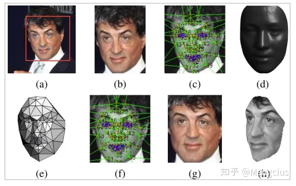 - (f)分段仿射变换:最后的正面化是通过由67个基准点衍生的Delaunay三角剖分引导的分段仿射变换(piece-wise affine warping)实现的