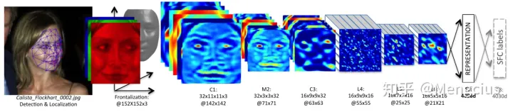 - 人脸表示(人脸识别):利用9层深度神经网络导出人脸表示,还使用了3个无权重共享的局部连接层。人脸表示特征向量是4096维,Softmax分类。开了先河,后面再也不用LBP了。