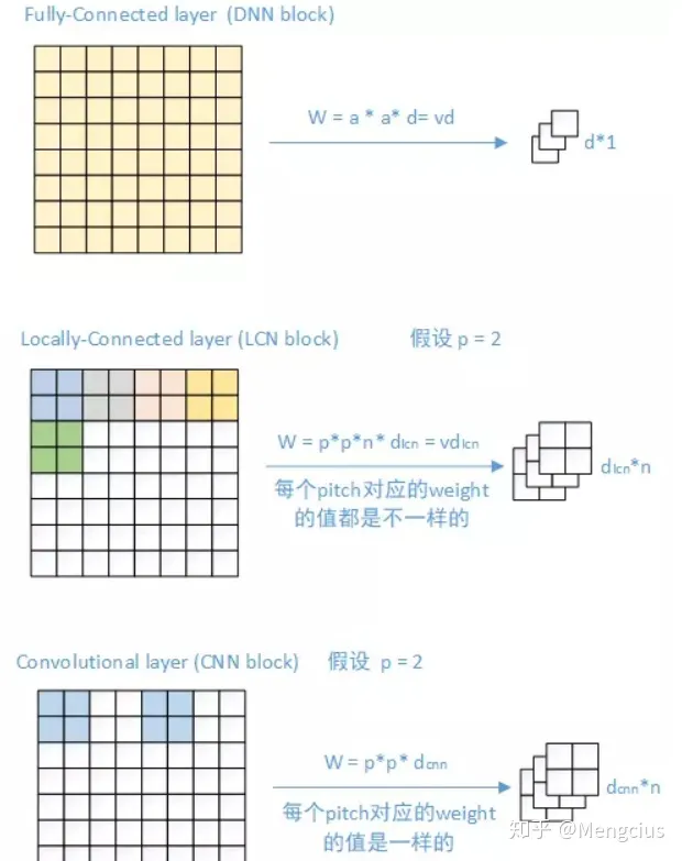 - 局部连接层(Locally Connected Layers,LCN):在不同的区域有不同的特征分布时,适合用local-Conv。每个点的卷积核都不一样,权重不共享。