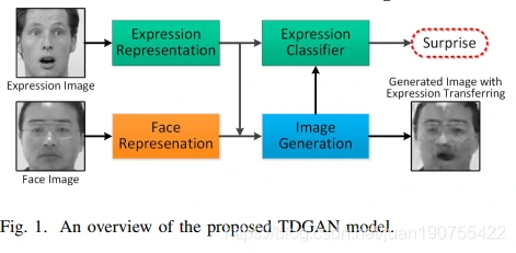 本文提出的TDGAN模型,具有两个独立的分支:表情分支用于表情信息的处理,面部分支负责其他面部属性信息的编码。如Fig.1所示。模型以一对图片作为输入,图片对包括一个表情图片和一个面部图片(分别来自不同的数据集)。TDGAN的生成器分别学习两张图片的表情表征和面部表征后使用一个解码器融合,然后通过迁移表情图片中表情到面部面部图片的方式生成一张图片。最后,通过两个分支,一个用来判断面部信息,一个同来判断表情信息。