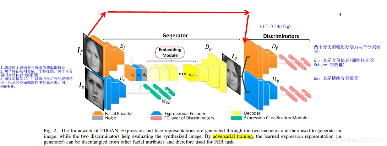 2中的内容也就是提出本文方法的初衷:通过对抗学习的方式,同时学习面部表情特征和面部ID属性特征,通过表情迁移的方式把表情从一个脸上迁移到另一个脸上(图片生成),让模型能够更好的分离面部ID信息和面部表情信息。