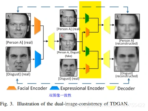 TDGAN首先通过两个编码器生成表情和面部特征,然后将两个特征融合并引入噪声(三块内容通过信道级拼接合成)。