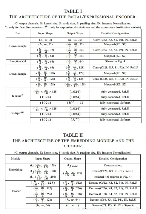 通过一个嵌入层对融合的特征进行编码,并通过上采样方式生成Ig(模型生成的图片)。最后通过两个分支,对生成的图片进行分辨,两个辨别器分支分别为面部ID辨别器分支和表情辨别器分支。两个辨别器用来评估合成的图像的效果。如果合成的图像能够欺骗辨别器,说明模型学习到的特征已经很好。