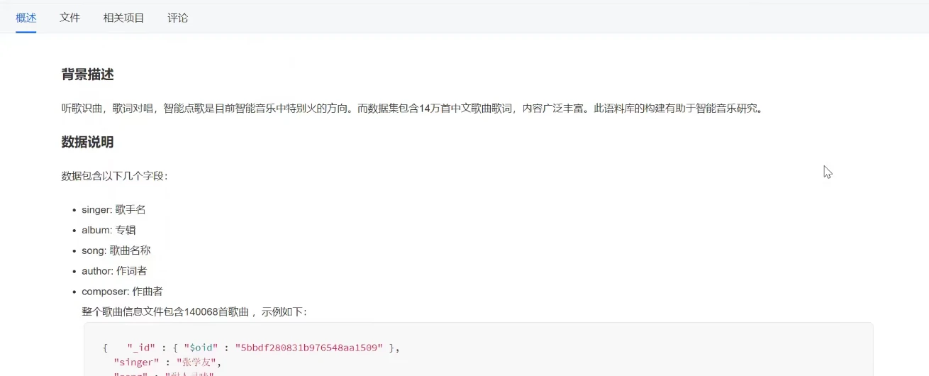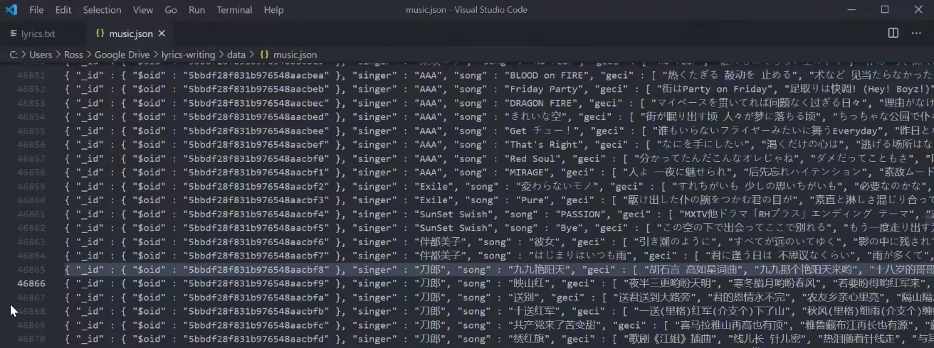 在下载的原始数据集中我们可以看到很多非中文歌曲,以及有些歌词中的格式不工整,有些歌词的前面包含了不需要的信息。