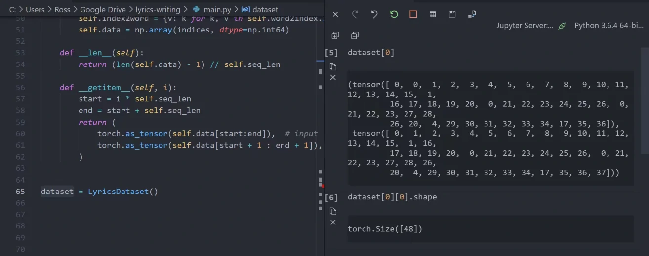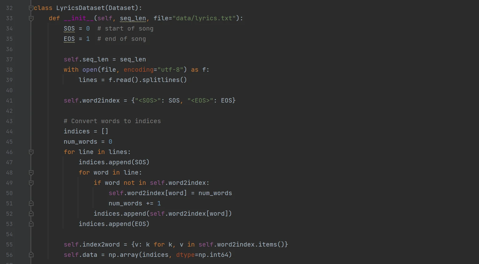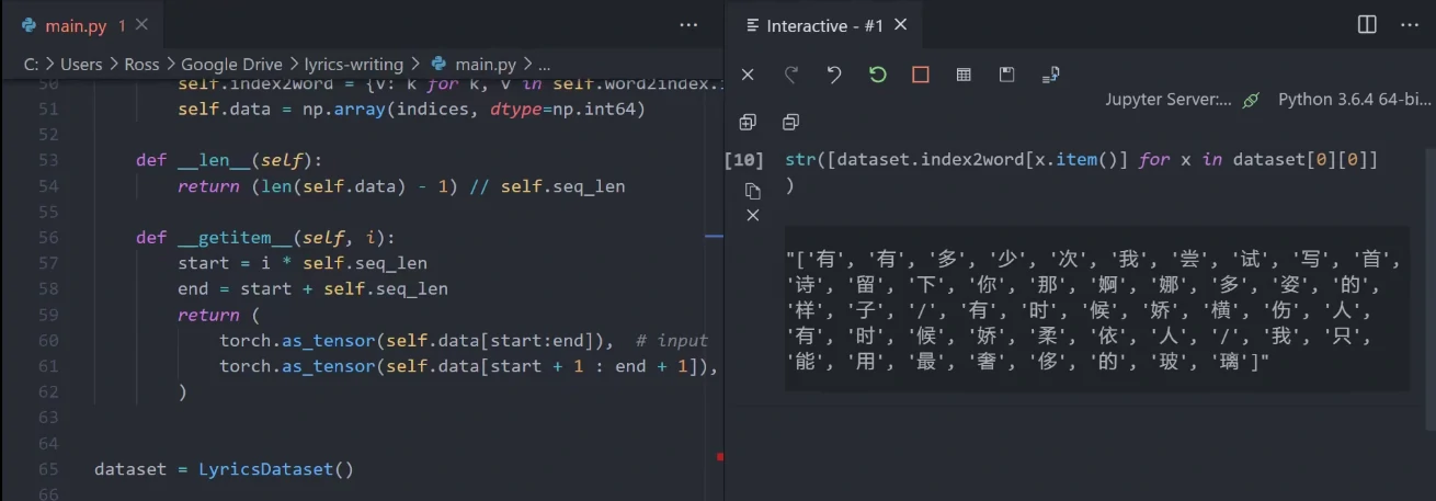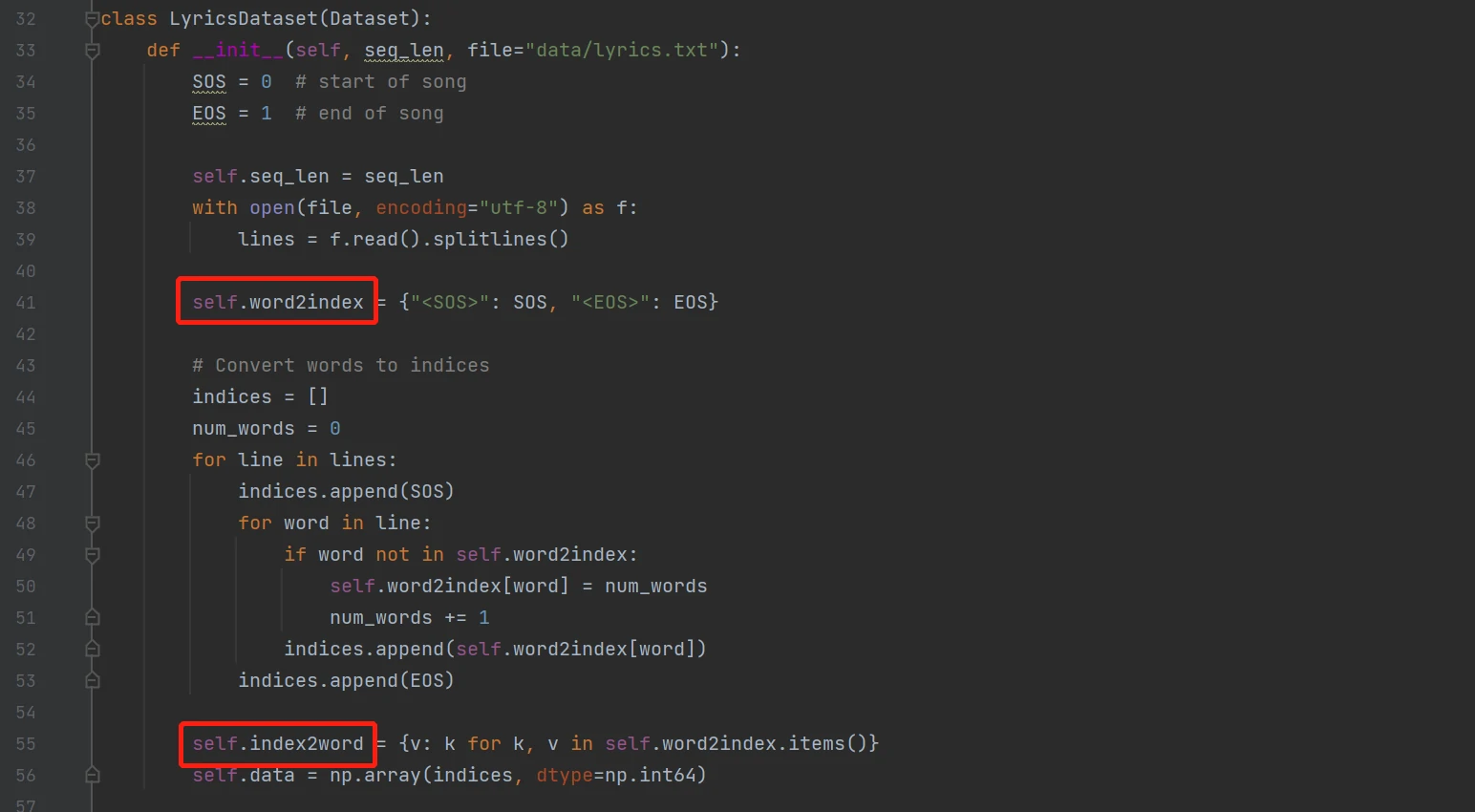 我们可以通过继承DataSet类来定义我们的歌词数据集,接下来我们在init函数中加载之前的这个歌词文件,并将所有的文字转换成一个个索引。【PyTorch神经网络不支持“字符”类型的输入,我们需要将文字转换成不重复的整型值才能传递给网络】