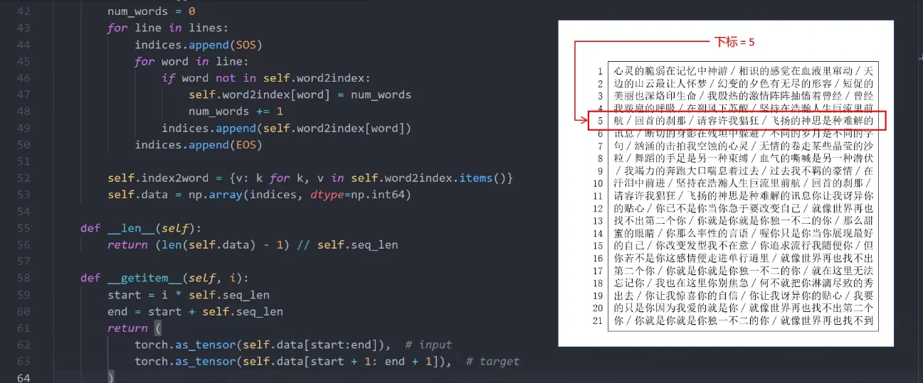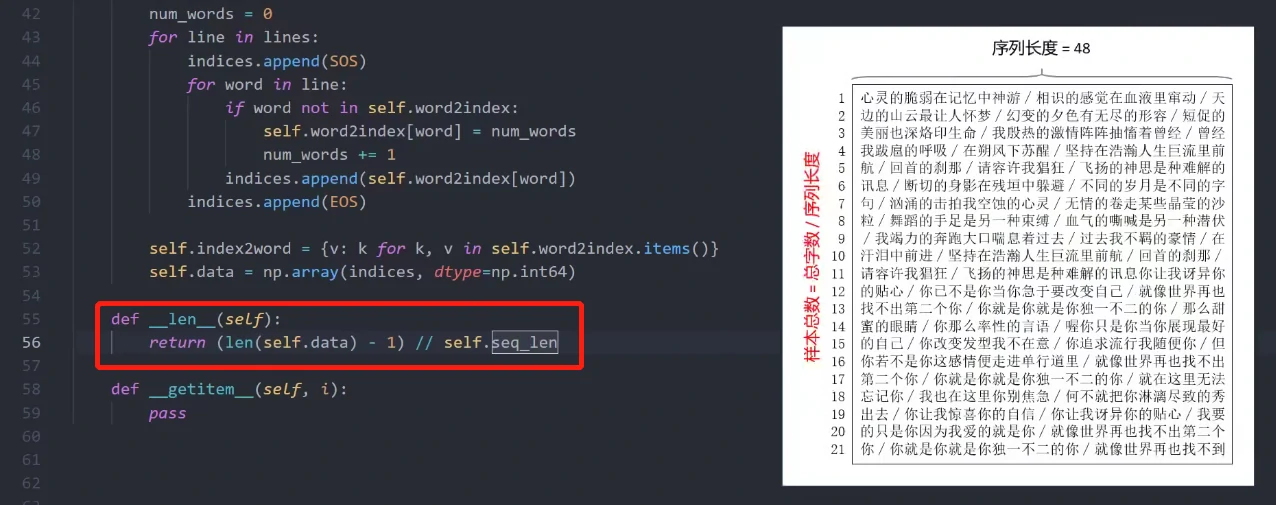 接下来我们需要实现两个函数,第一个函数len,我们需要返回样本的总数。这里我们将所有歌词文本拆分成一个个长度为48的序列,所以样本总数(seq_len)等于文字的总数/序列长度(48),这里为什么减1,后文会提及。