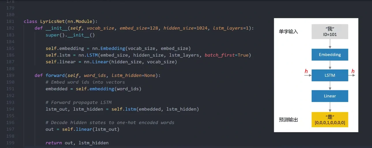 接着我们将这个向量传入一个LSTM单元,最后通过一个线性层转换成输出的文字。