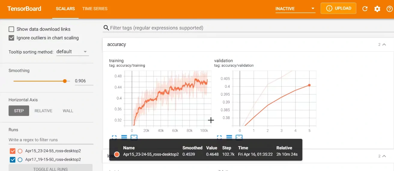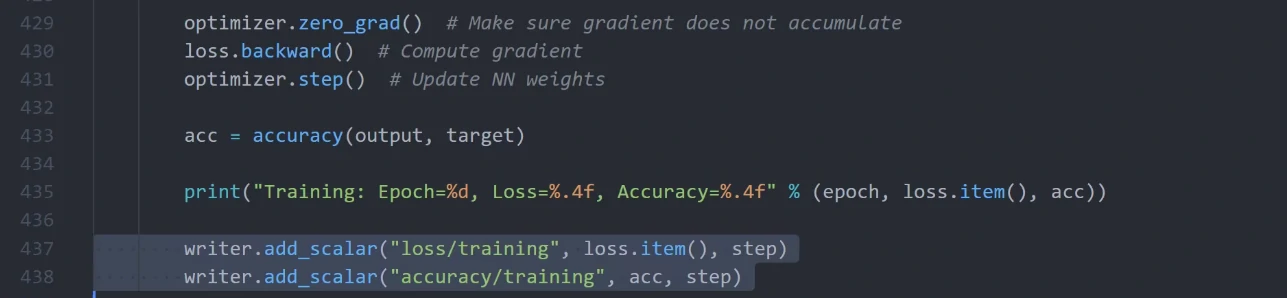 另外在训练的过程中,我们可以将loss打印出来以方便我们跟踪模型的训练进度。这里我们还可以用到Tensorboard这个库,然后可以调用add_scalar()来绘制像loss、精确度这样标量的数据,命令行调用tensorboard –logdir=runs可查看。