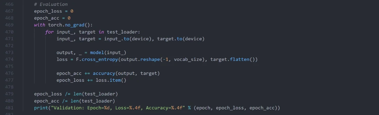 评估的代码和训练非常相似,除了我们不会计算梯度来更新网络的权重。我们同样会输出一个loss,然后观察这个loss下降的情况,因为单纯训练loss的降低并不能代表模型表现得很好,模型也有可能过度拟合(Overfit)我们的训练数据,也就是说我们的模型对于训练数据表现得很好,但是对于从没有见过的数据却表现得很差。