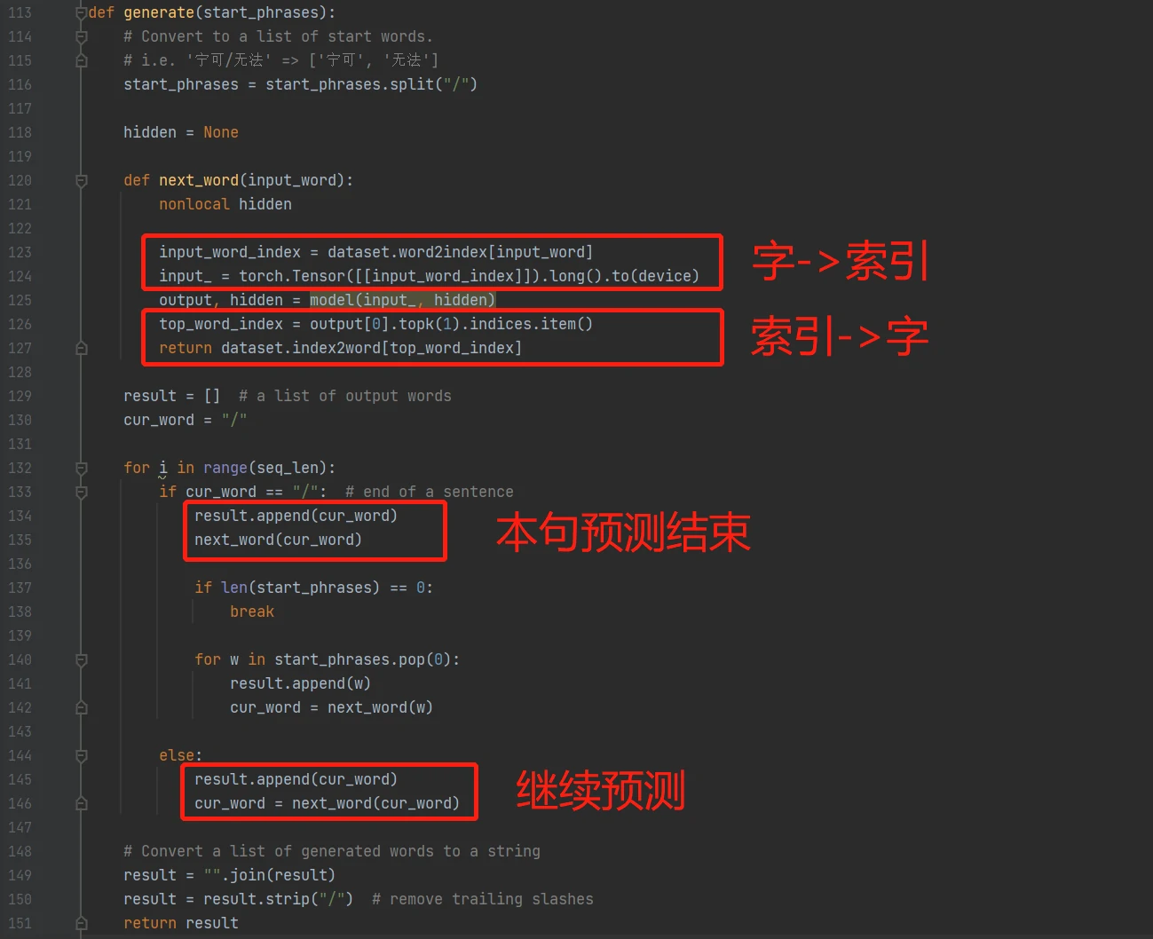 这里的next_word函数会将当前字符传入神经网络然后返回预测的下一个字,中间也会维护一个隐藏状态hidden