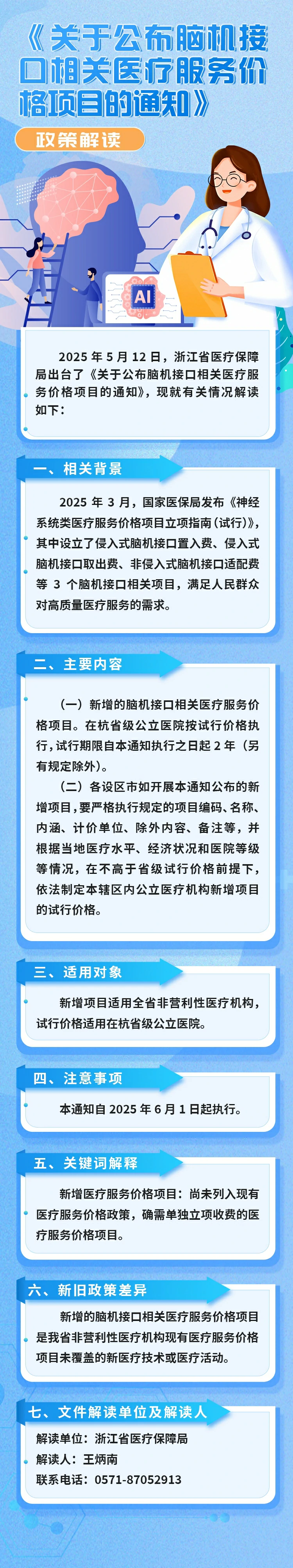 一图读懂《关于公布脑机接口相关医疗服务价格项目的通知》政策解读 发表于 2025-05-16 分类于 🌙进阶学习 , ⭐脑机接口与混合智能研究团队(BCI团队) , 💫政策 阅读次数: Valine: 本文字数: 66 阅读时长 ≈ 1 分钟 原文链接http://ybj.zj.gov.cn/art/2025/5/16/art_1229667819_2555211.html
