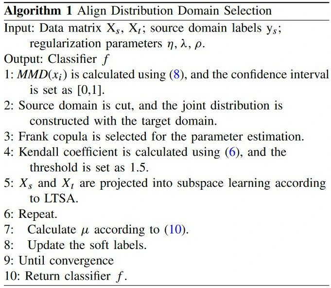 他们首先提出使用 Copula 函数对跨受试者脑电信号之间的非线性相关性进行建模并设置权重,然后通过改进的最大均方差(MMD)方法将源域数据集的权重相加,对源域数据进行滤波,以更好地传输滤波后的数据。最后,基于 MEDA,他们提出了一种迁移学习方法,该方法在将数据投影到流形空间时,在降维过程中使用局部切线空间对齐(LTSA)来保持数据的原始空间结构,以提高分类精度。