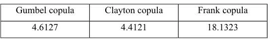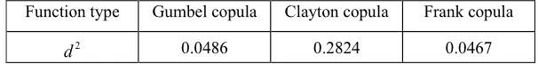 表 1 是不同函数的参数量,表 2 是不同 Copula 函数得到的欧几里得距离,较小的距离对应的 Copula 函数拟合性较好,可以看到,Frank Copula 函数拟合性最好。