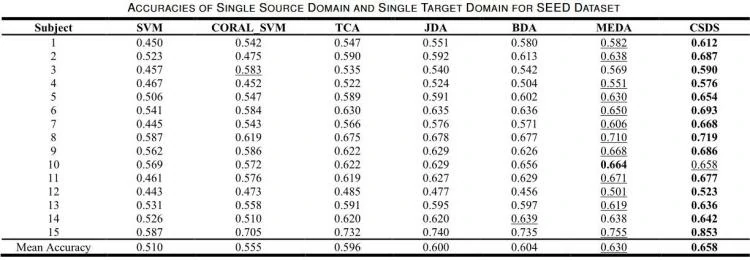 表 3 是不同方法在 SEED 数据集中准确率的比较,可以看出作者提出的 CSDS 效果最好。