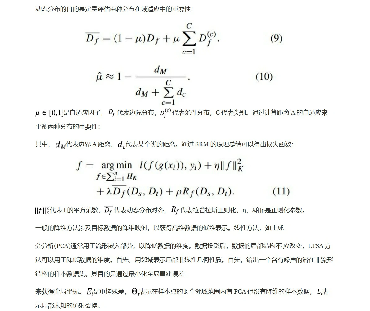在传统特征匹配的领域自适应方法中。条件分布和边际分布的重要程度是不相等的,在原始 空间对齐分布会导致其特征的失真。这种效果并不理想。新的研究中提出了一种避免特征失 真并定量估计边缘分布和条件分布的重要性的方法。首先,为了消除退化的特征,流形特征 泛函 g(.)是在格拉斯曼流形 G(d)中研究的,引用测地流核(the geodesic flow kernel,GFK)来促进其域适应。
