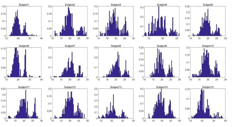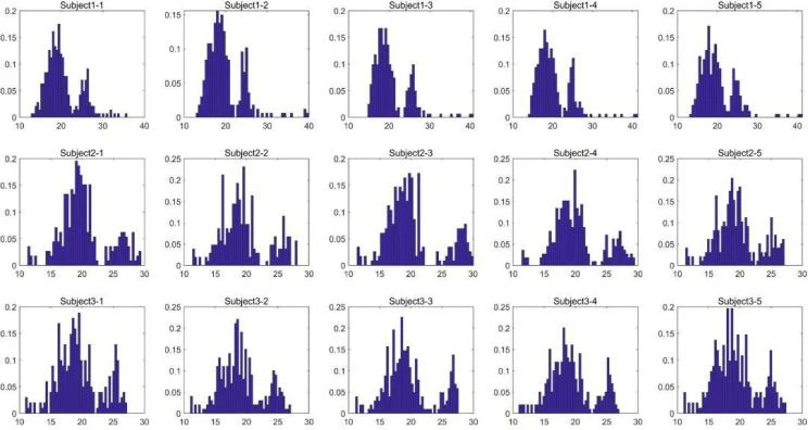 不同受试者的频率直方图的差异比同一受试者的不同数据更显著。简化的过程如图 2 所示, 图中显示了不同受试者的数据差异,从数据的分布可以看出明显的差异。