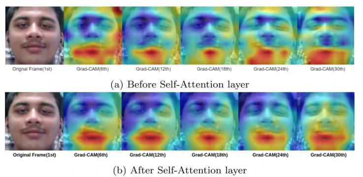 同时为了证明本论文提出的时空自注意力机制的有效性,取相同一组帧序列分别在有无时空自注意力机制条件下用Grad-CAM热力图进行可视化。根据图7的可视化热力图显示,在有自注意力机制情况下,DenseNet网络可以更好地定位到人脸中的重要部位,从而获得一个更好的分类结果。