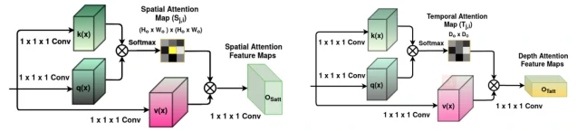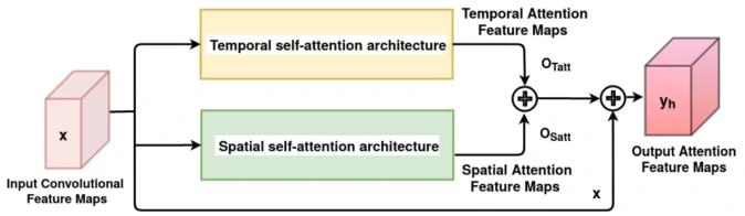 如图3所示,空间自注意力机制和时间自注意力机制就是利用可训练的三个卷积得到对应的Qx,Kx和Vx,之后计算得到对应在空间和时间上的相关重要特征。而时空自注意力机制如图4所示则是将两者作为两个分支,将得到的特征与原始输入x进行加和,并且得到的效果最佳,用该策略进行后续的专注度检测分类,公式如下所示: