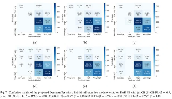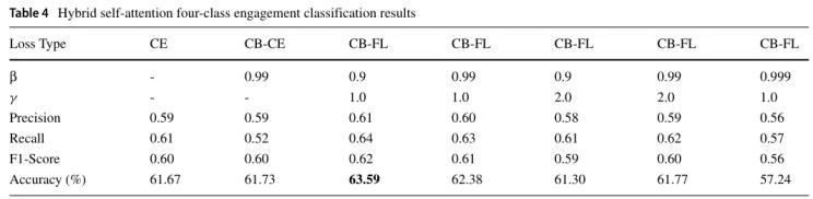 根据图5中的表格所示,对于在DAISEE数据集上的四分类实验中,采用CB-FL损失函数普遍好于其他类型的损失函数,并且当超参数γ和β分别为1.0和0.9时,模型的效果最佳,可达到63.59%的好结果。同时在时空自注意力机制和CB-FL损失函数的帮助下,DenseNet网络对于部分小样本的分类有了一定的改善,如图6混淆矩阵图中的b所示。