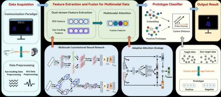 脑机接口(BCI)技术结合脑电信号(EEG)和眼动信息直接检测大脑神经活动,能为客观评估DOC患者残余意识提供有效途径。特别地,开发一个高效可靠的多模态BCI仍然是一项挑战,例如在多模态信息融合、小样本数据特征挖掘及对微意识患者的适用性上。为克服现有技术的局限性,提高BCI系统性能,本研究提出了一种新的多模态BCI系统。该系统结合了P300电位检测与眼动追踪技术,旨在为DOC患者提供更准确、更低门槛的交流方式与意识诊断工具。