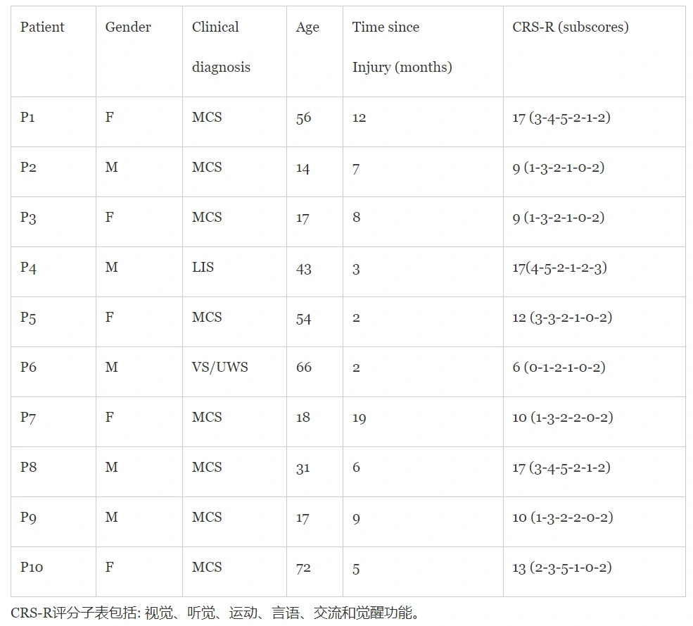 实验人员:研究团队共招募10名健康志愿者与10名意识障碍患者(包括1例闭锁综合征(LIS)、8例微意识状态(MCS)、1例植物状态(VS))。所有患者均在实验前一周内进行了CRS-R意识状态评估。