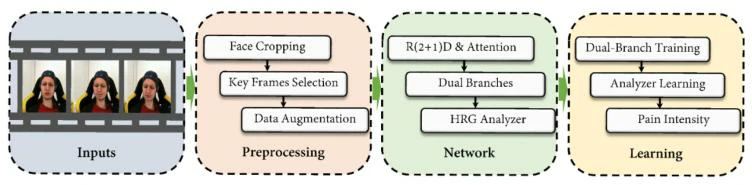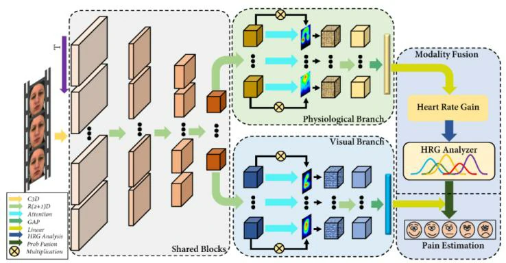 文章介绍了以两种分支(即视觉和生理)估计视频中的疼痛强度的方法,流程图如图1所示。该方法主要包括数据预处理、深度网络和参数学习三个过程。在对视频序列进行预处理后,将其输入双分支网络以提取动态疼痛感知特征。视觉分支提供来自面部区域的视觉特征,而生理分支输出心率增益(HRG)作为生理模态的表示。在此基础上,实现了HRG分析仪,将HRG与疼痛强度联系起来,并结合HRG与视觉分支进行最终的疼痛估计。