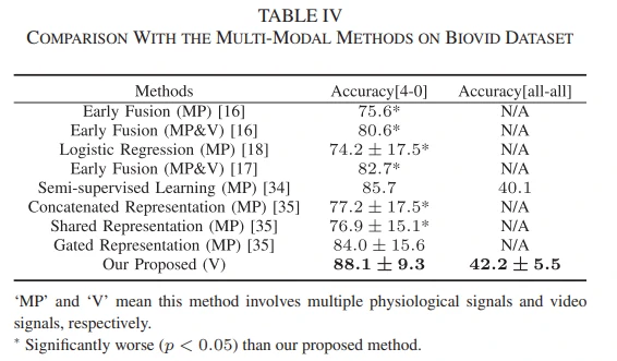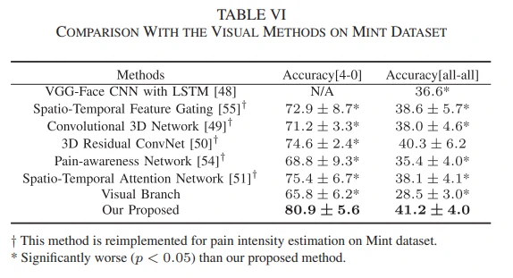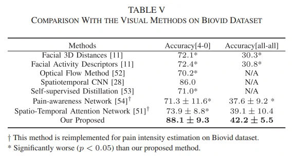 在BioVid数据集,作者把提出的方法与一些多模态方法(结合不同的生理信号,或者把生理信号与视频信号相结合)、视觉方法进行比较,结果分别见表4和表5。此外,作者复现了一些在动作识别中具有代表性的视觉方法,把提出的方法和这些方法在Mint数据集上进行比较,结果见表6。从实验结果可以看出,提出的方法取得最好的结果。