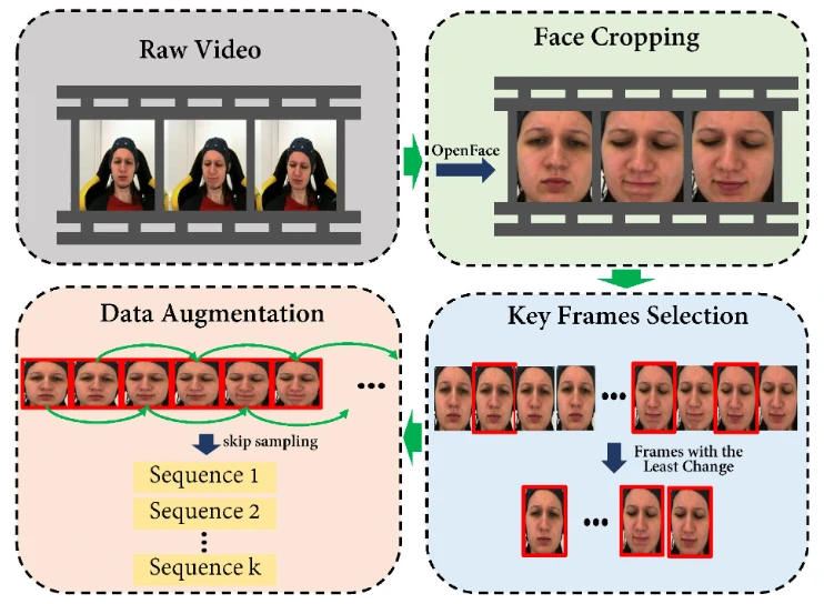 - 关键帧选择:另一项任务是如何从视频序列中提取出多个图像帧以减少冗余。由于并非所有图像都包含疼痛表情,只有面部区域变化的图像帧才能代表疼痛的强度。文章使用在视频序列的时间窗口中选取最具代表性的帧的方法来选取视频的关键帧。