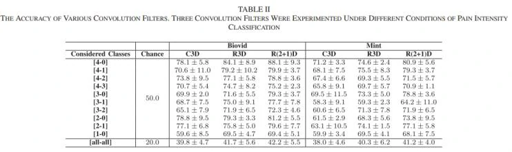 - Mint数据集:多模态强度疼痛(Mint)数据集也可以用于疼痛估计。本数据集共包含20个研究对象。它包含了一系列被电痛刺激的受试者的面部视频。图5第二行显示了该数据集的一些示例。该数据集记录了9366个不同的视频序列,187 939个图像帧。每个序列都标有相应的电痛强度。疼痛级别与Biovid数据集相同,也分为五种强度。文章使用的数据集中的疼痛强度是均匀分布的,即每个强度的样本数量是相等的。此外,为了比较实验结果,报告的结果与这些数据集的性能指标以精度的均数±标准差表示。