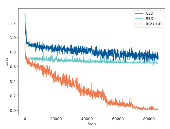 文章首先评估三种卷积滤波器的有效性,分别包括:C3D,R3D和R(2+1)D滤波器。为了公平比较,只替换卷积核(即C3D和R3D),而保留所提出的网络的其他部分。结果如表2所示。实验结果表明,采用R(2+1)D卷积算法可以获得最佳的性能。这表明该卷积滤波器在疼痛估计中具有更好的特征表示能力。图6所示的训练过程表明,R(2+1)D收敛更快,表明该网络更容易优化时空解耦的操作。