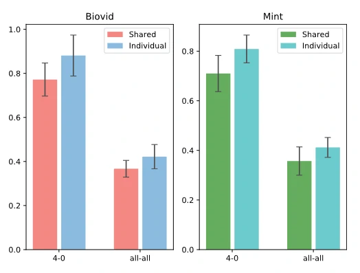 此外,从视觉分支和生理分支的比较来看,疼痛估计任务中两者可以互相提供更多信息,提高准确率。文章还测试了所有参数完全共享的情况,结果如图9所示。这说明面部疼痛和伪生理特征的重点关注区域并不完全是同一区域。虽然它们在低级特征上可能有一些相关的联系,但在注意力机制层上存在一些差异。为了验证文章的想法,文章还将生理分支的注意图可视化,如图8第3行所示。