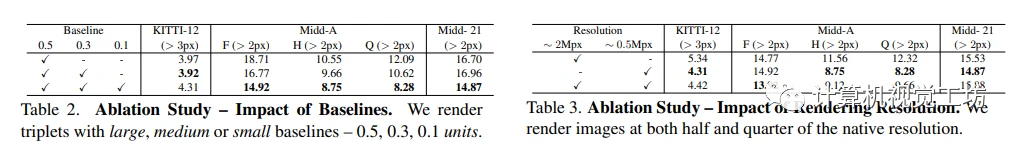 作者使用渲染视频生成大规模立体训练数据集的方法,涉及渲染参数选择,标签生成和代理损失的选择方法等。在进行降板研究时,作者发现在他们的数据集上使用L3ρ损失是最佳的,这利用了他们的渲染三重组合产生的三角形几何形状的自监督。本文还介绍了使用虚拟基线对视差分布的影响,评估了渲染图像的分辨率以及收集的场景数量在训练过程中的影响。作者发现,更多的图像及更小的虚拟基线可以提高模型的性能。在最具挑战性的数据集上使用更多场景可以显著提高模型的准确性。