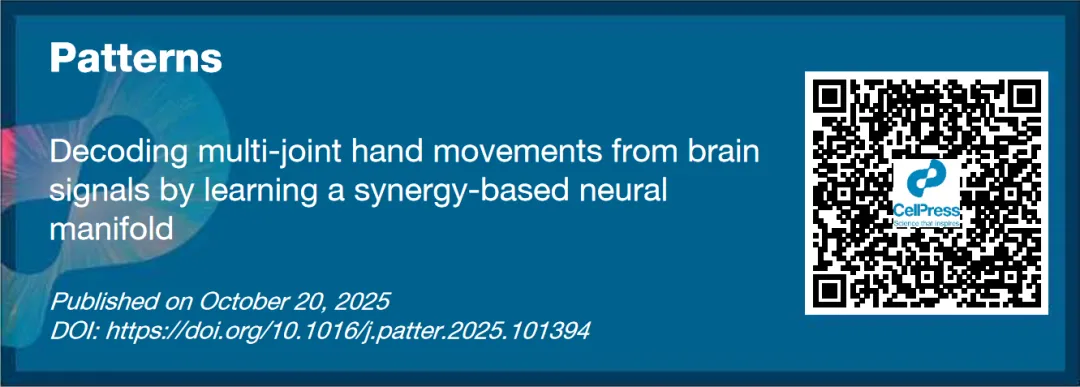2025年10月20日,浙江大学脑与脑机融合前沿科学中心祁玉/王跃明团队在Cell Press细胞出版社旗下期刊Patterns在线发表题为“Decoding multi-joint hand movements from brain signals by learning a synergy-based neural manifold”的研究论文。该研究提出了基于协同基元的手部精细运动神经编解码计算模型,有望为高性能脑机接口提供高效解码方案。