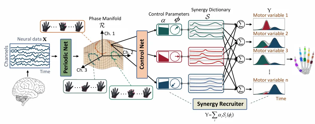 为获取适用于神经控制的运动协同基元,本研究提出SynergyNet框架,通过构建神经活动与手部运动的联合表示,并解码协同基元的时空激活模式,以模拟大脑对复杂运动的调控机制。具体而言,在神经流形刻画方面,研究团队发现周期性相位流形可有效表征神经活动模式,并采用周期性自编码器技术从高维神经信号中提取出运动控制流形。在运动层面,将高自由度的复杂手部动作分解为时序运动协同基元的线性组合,并基于从神经流形中解析得到的时空参数,调度特定运动控制基元,实现神经-运动流形的联合建模。