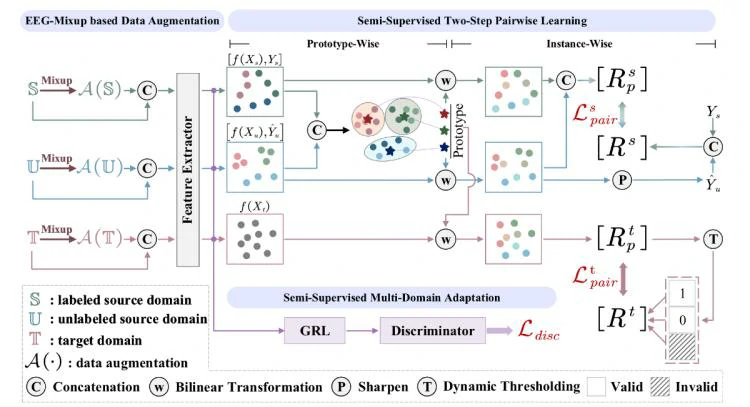 作者提出的 EEGMatch 的半监督学习框架由三个模块组成。(1) 基于 EEG‑Mixup 的数据增强:生成增强数据并增加建模的样本量。(2) 半监督两步成对学习:在考虑全局特征表示(原型方式)和局部内在关系(实例方式)的情况下提升特征学习。(3) 半监督多域自适应:对标记源域 (S)、无标记源域 (U) 和目标域 (T) 之间的分布偏移进行对齐。
