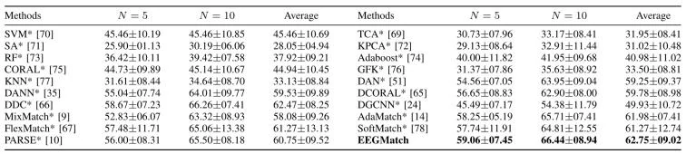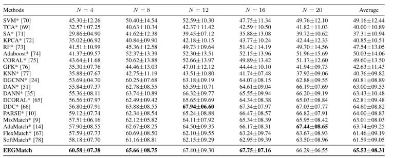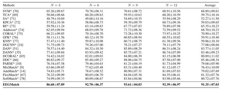 表I报告了在SEED数据集上的实验结果,对于每个受试者,N个试验有标签,15-n个试验没有标签。复现的模型结果用“*”表示,与现有流行的机器学习或深度学习方法进行了比较。结果表明,在不同的不完整标签条件下,与其他模型相比,所提出的EEGMatch获得了更好的性能,其中N=3、6、9、12的平均模型性能为91.35±07.03。与文献中最佳竞争对手实现的性能相比(DDC:85.46±08.34),不同N值下的平均性能提高为5.89%。它表明,即使只有少量的标记数据(当N较小时),EEGMatch仍然可以很好地利用标记源数据(S)和未标记源数据(U)来增强模型泛化能力,并在目标域(T)中达到令人满意的情感识别性能。表II和表III报告了在不同不完全标签条件下在SEED-IV和SEED-V数据集上的实验结果,这也显示了所提出的EEGMatch在半监督跨被试情感识别任务上的优越性。具体来说,SEED-IV数据集上N=4、8、12、16、20的平均模型性能为65.53±08.31。此外,在N=5,15的SEED-V数据集上的平均模型性能为62.75±09.02。与文献中的最佳结果相比,SEED-IV数据集在不同N值下的平均性能增强为0.93%(DDC:64.60±08.82),SEED-V数据集为0.28%(DDC:62.47±08.25)。另一方面,在两个数据集上的实验性能提升不如在SEED数据集上明显。一个可能的原因是数据集中更多的情感类会使预测的伪标签)更加不稳定。