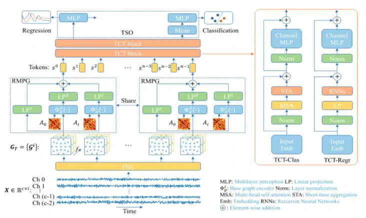 图结构初始化:将每个 EEG 通道视为图中的一个节点,节点的属性即为上述频谱特征。图的边(即通道间的连接关系)不预先定义,而是通过后续模块中的可学习邻接矩阵动态生成。最终,一个 EEG 段被表示为一个时序图序列,同时保留了空间拓扑与时间顺序信息。