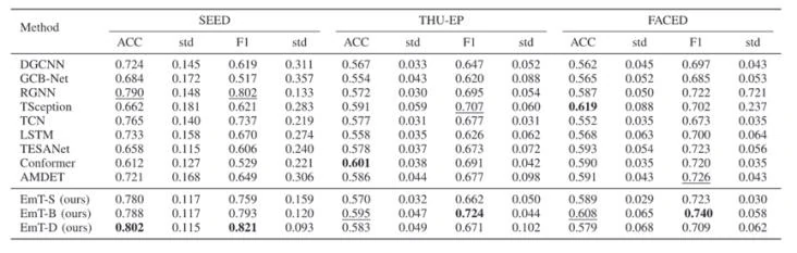 在SEED、THU-EP和FACED三个数据集上进行了二分类(正面vs负面)实验,以准确率(ACC)和F1分数作为评价指标。表2展示了 EmT 变体与多种基线方法的对比结果: