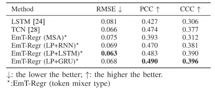 在情绪回归任务中,EmT-Regr 系列模型整体表现最优。其中,EmT-Regr(LP+LSTM)在 RMSE 指标上取得最低值(0.063),而 EmT-Regr(LP+GRU)在 PCC(0.490)和 CCC(0.396)指标上达到最高。这一结果证实了其 RNN-based Token Mixer 设计的有效性,使其能更好地建模情绪的连续演变。实验同时揭示任务适配的决定性作用:错误使用分类任务的 MSA 机制时,模型性能(PCC与CCC均显著低于基线)显著下降。这说明,将情绪视为连续变化过程的建模假设,在回归任务中是合理且有效的。