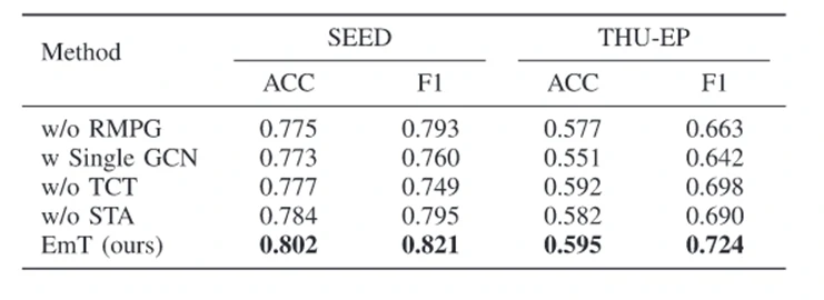 如表4所示,论文通过系统的消融实验验证了 EmT 各核心模块的贡献。在 SEED 和 THU-EP 数据集上,在移除关键组件后,模型性能均出现不同程度的下降。