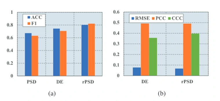 rPSD 特征在两项任务上综合表现最佳。在分类任务中,rPSD 相比DE和PSD显著提升了ACC和F1分数;在回归任务中,rPSD 也取得了最优的RMSE和CCC。
