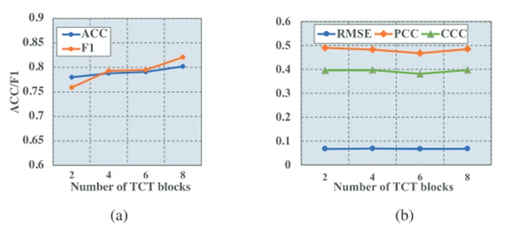回归任务:回归任务中,TCT 块数对回归性能(RMSE、PCC、CCC)的影响相对较小。这与回归任务选用循环混合器(RNN/GRU)有关,其时序建模方式对深度不敏感,因此在回归任务中,浅层的 EmT-S 即可取得较为稳定的性能。