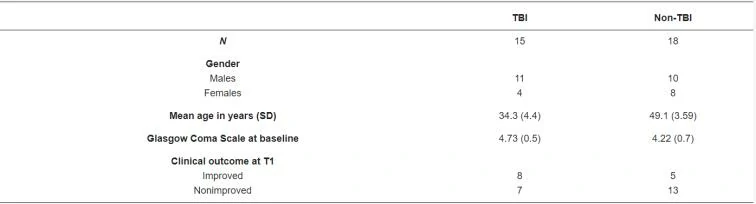 本研究包括 33 名 DoC 患者(其中21 名 19-71 岁的男性)。描述性统计(表 1)显示 15 名患者患有创伤性脑损伤,而 18 名患者有非创伤性病因(即血管性和缺氧性脑损伤)。如表1所示。