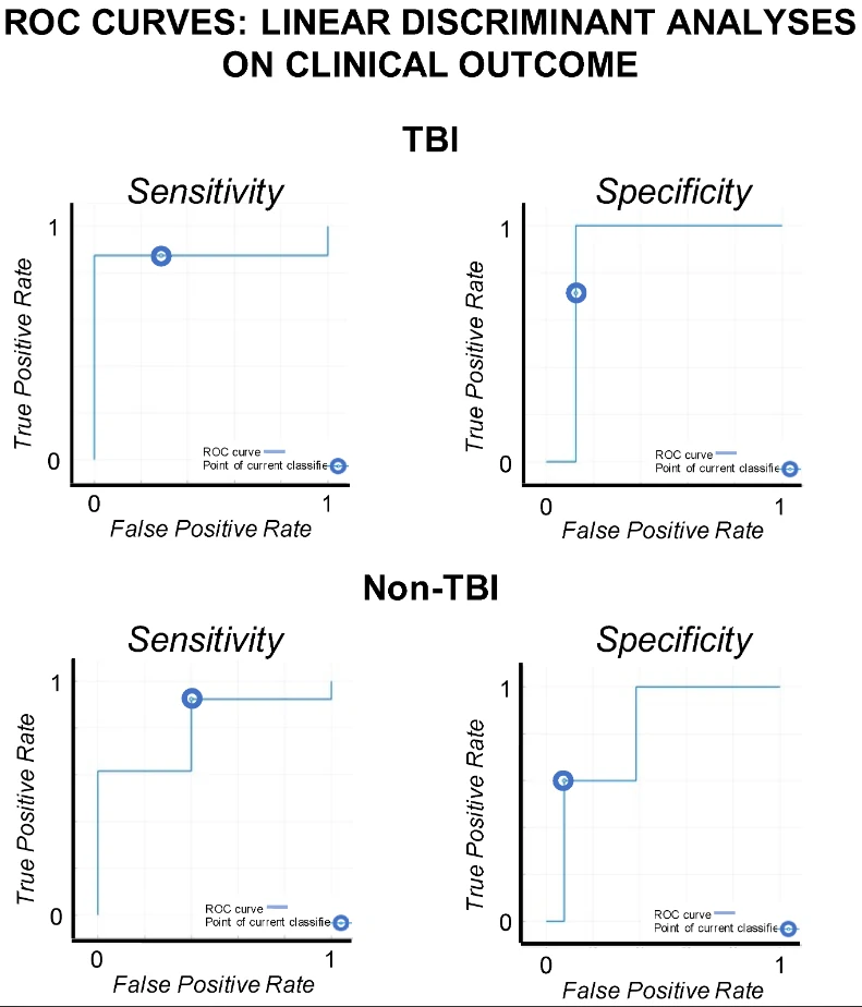 线性判别分析对患者临床结果(TBI与NTBI患者)的敏感性和特异性曲线如图3所示。