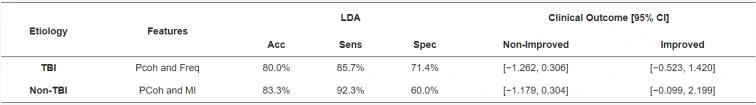 在 TBI 组中,全局 PCoh和主要频率测量之间的组合导致 6 个月结果的最佳辨别准确度(accuracy = 80%,balanced accuracy = 78.55%,precision = 77.7%),sensitivity(即患者被正确分类为未改善患者)为 85.7%,specificity(即患者被正确分类为改善患者)为 71.4%。单独或联合采取的其他考虑措施导致总体区分准确度 < 73.3%。在非 TBI 组中,两个功能连接性指数(MI 和 PCoh accuracy = 83.3%,balanced accuracy = 76.65%,precision = 85.7%)的组合证明了最佳区分精度,sensitivity= 92.3%,specificity= 60.0%。单独或联合采取的其他考虑措施导致总体区分准确度 < 83.3%。对相同 EEG 特征的多变量逻辑回归进一步证实了 LDA 在区分 TBI(accuracy = 80%)和非 TBI 患者(accuracy = 83.3%)的改善和未改善患者方面的准确性结果。