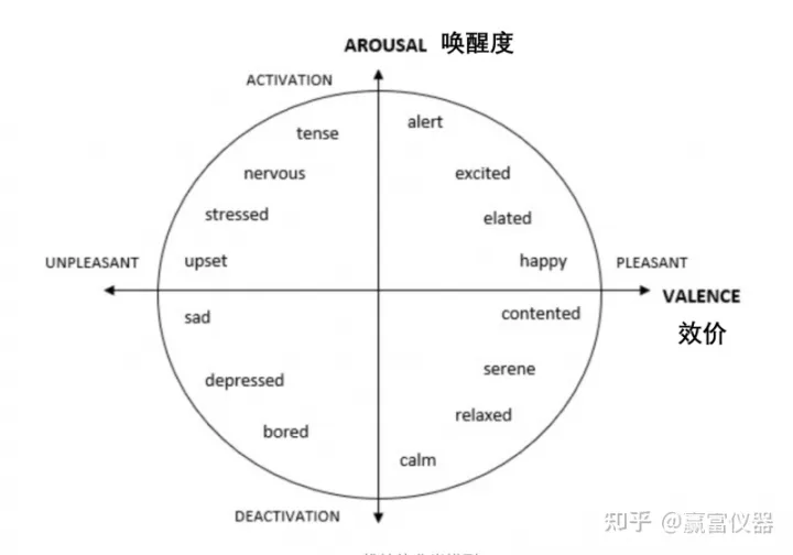随着情绪研究的深入,人们认识到情绪的产生和消失是一个连续不断的过程,从而提出了连续模型。连续模型认为每种情绪都是一个连续体上的一部分,每种情绪状态都可以在二维空间或者三维空间中找到与之对应的一点。常用的连续模型是二维情绪模型,基于认知评价将情绪空间划分为效价和唤醒两个维度,效价表示情绪是积极还是消极的,唤醒度反映情绪的强烈程度。