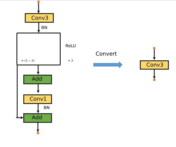总的来说,这种设计使得模型在训练过程中借助多层卷积和非线性获得更强的学习能力;推理阶段,非线性消失则为减少网络深度提供了可能。
