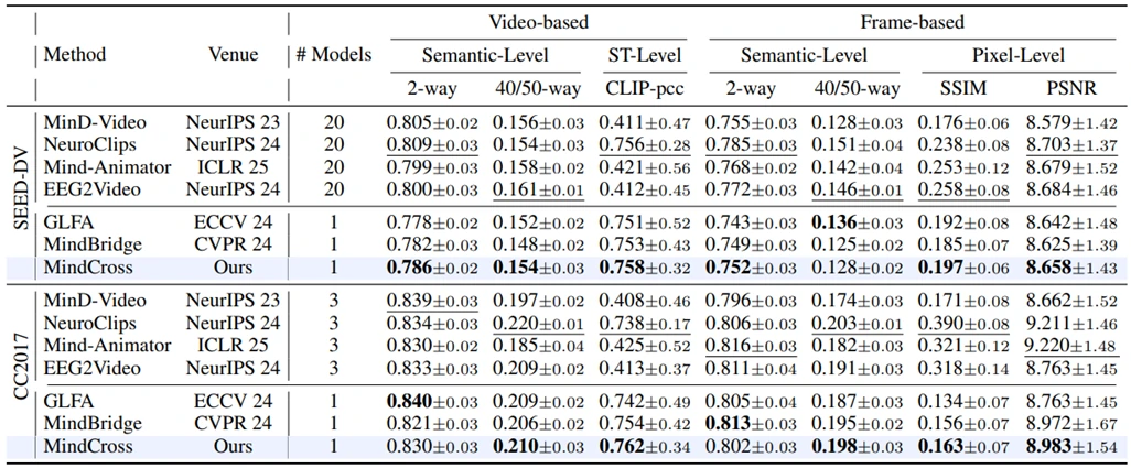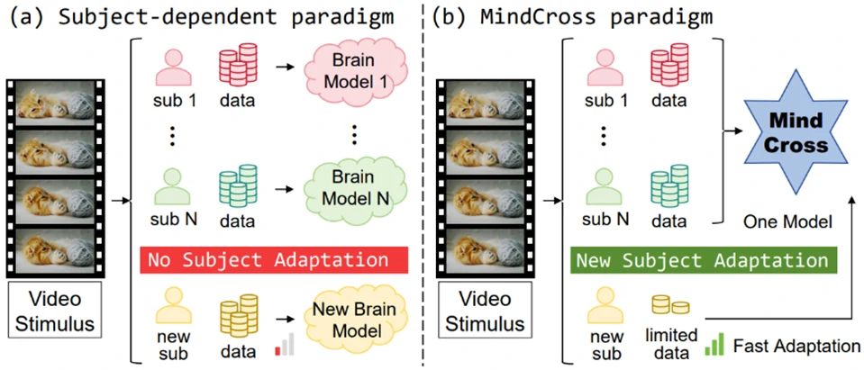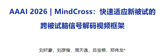 近年来脑机接口(BCI)技术飞速发展,从脑信号解码视频成为了其中一个热点问题。近期,上海交通大学郑伟龙团队提出了一种基于共享-特定结构的快速适应新被试的跨被试脑信号解码视频框架MindCross, 相关成果发表于人工智能顶级会议(CCF-A类AAAI 2026上,标题为“MindCross: Fast New Subject Adaptation with Limited Data for Cross-subject Video Reconstruction from Brain Signals”。如图1所示,现有的脑解码框架主要基于被试依赖范式,需要采集每个受试者大量的脑数据,导致难以快速适应一个数据较少的新被试,毕竟脑视频数据的采集成本高昂,而MindCross为所有被试训练一个通用模型,该模型能够快速适应数据有限的新被试。